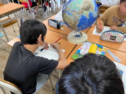 4月15日(月)4時間目、5年1組は社会科で地球はどのような姿をしているか調べていました。 陸と海の割合を地球儀で調べていました。