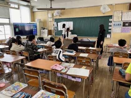 4月16日(火)1時間目、6年2組は算数で線対称の問題を解いて黒板にかいていました。