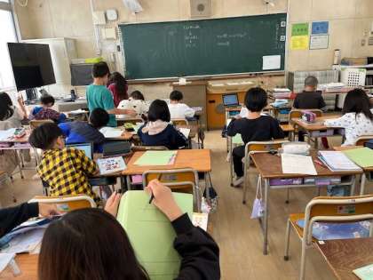 4月19日(金)1時間目、4年2組は算数で「たしかめ」のなおしをしたり、計算ドリルのなおしをしたりした後、プリントにチャレンジしていました。