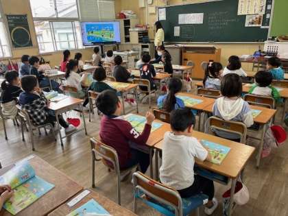 4月22日(月)1時間目、1年1組は音楽で教科書の絵から思い浮かべる歌を楽しそうに歌っていました。