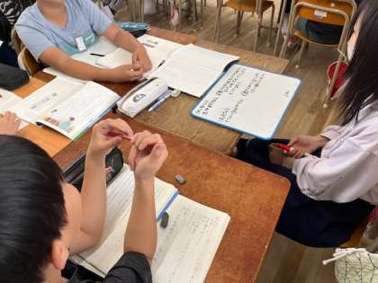 4月23日(火)3時間目、6年2組は国語で「さなぎたちの教室」を学習していました。松田さんと高月さんの人物像を班で話し合って発表ボードに書いていました。