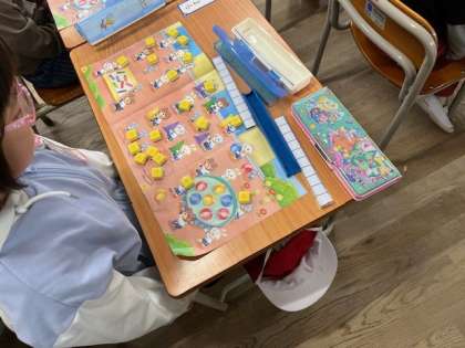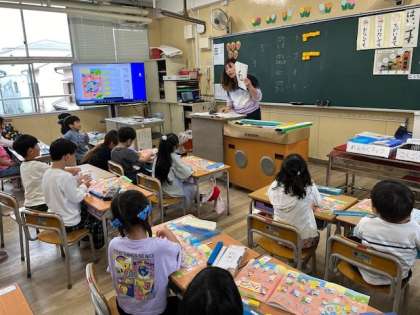 4月23日(火)3時間目、1年1組は算数で教科書の絵とブロックを一対一対応させた後、数と数字を結び付けて言う練習をしていました。