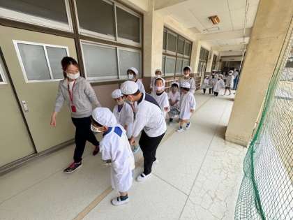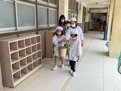 4月24日(水)1年生は6年生に手伝ってもらいながら、給食当番を頑張っていました。
