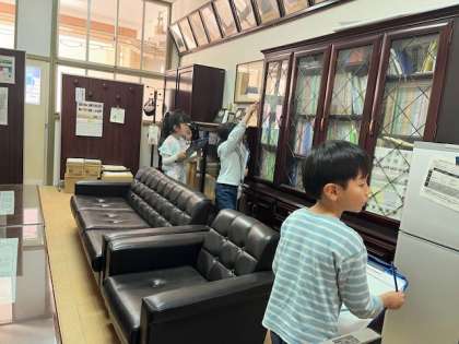 4月25日(木)5時間目、2年2組は生活科で1年生に学校案内するために、自分が紹介したいところを調べに行きました。校長室へ来たグループはどのようにして1年生に紹介するとよいかを考えながら、一生懸命調べていました。さて、うまくいきますでしょうか・・・。