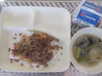 こくとうパン、ぎゅうにゅう、カレースープスパゲッティ、キャベツのピクルス、おさつチップス