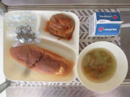 おさつパン、ぎゅうにゅう、にこみハンバーグ、やさいスープ、ミニフィッシュ