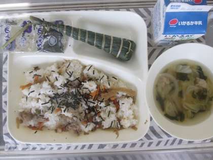 ごはん、ぎゅうにゅう、きんぴらちらし、きざみのり、すましじる、ちまき