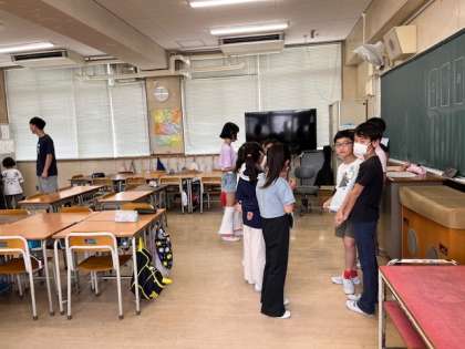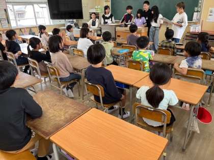 4月26日(金)3時間目、たてわりなかよし集会がおこなわれました。たてわり班で教室に集まり、自己紹介をした後、グループの副リーダーを決めました。その後運動場へ移動し、たてわり班で集会委員会の○×クイズを楽しみました。