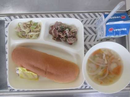 コッペパン、ぎゅうにゅう、ぶたにくのガーリックやき、スープ、ツナとキャベツのソテー、アプリコットジャム