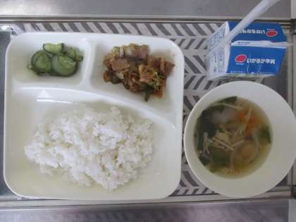 ごはん、ぎゅうにゅう、ホイコウロー、ちゅうかスープ、きゅうりのピリからあえ