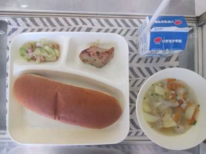 こくとうパン、ぎゅうにゅう、かつおのガーリックやき、おしむぎのスープ、キャベツのひじきドレッシング