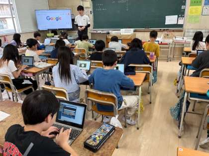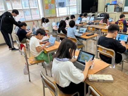 5月7日(火)1時間目、4年は1組も2組も「キーボー島アドベンチャー」というソフトを使ってローマ字入力の練習をしていました。