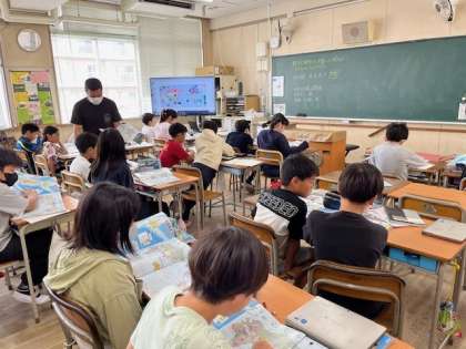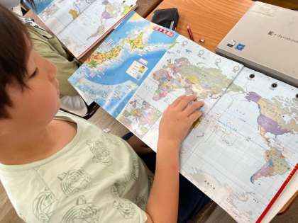 5月8日(水)3時間目、5年2組は社会科で世界地図を見て学習していました。