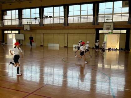 5月20日(月)2時間目、1年は体育館で体育をしていました。「位置について、ヨーイ、ドン」でスタートして走る練習をしていました。