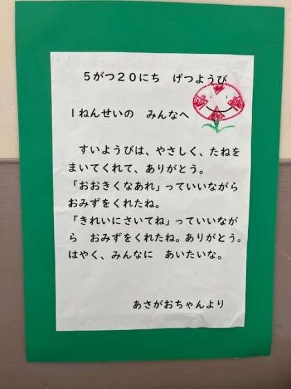 5月24日(金)1年のろうかに「あさがおちゃんからの手紙」が貼られていました。