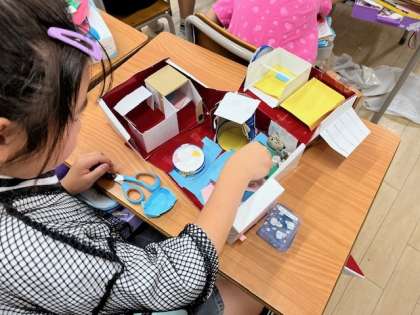 5月24日(金)1時間目、2年2組は図工で作った家に友達を入れて、タブレットで「ともだちハウス」の写真を撮っていました。