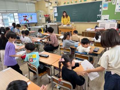 5月27日(月)1時間目、1年1組は生活科でアサガオやヒマワリの種を観察し絵を描いていました。