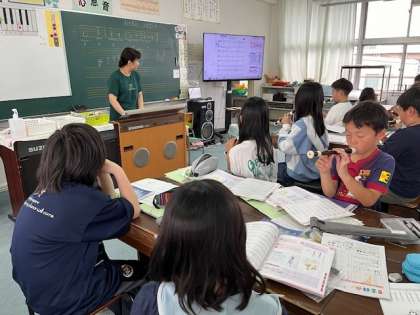 5月27日(月)2時間目、4年1組は音楽で「おやすみ」を階名唱し、リコーダーで吹いていました。次に、「風のメロディー」を合奏していました。