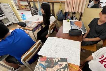 5月28日(火)1時間目、6年2組は図工で浮世絵の模写をしていました。富士山の雲を書くのに、あまりにも範囲が広く雲の数が多くてやる気をなくしている子がいたので、「模写する範囲をいくつかに分割してやってみたら?」とアドバイスしたところ少しやる気を取り戻したようでした。