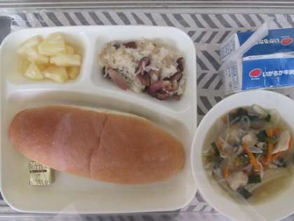 コッペパン、バター、ぎゅうにゅう、きんときまめのちゅうかおこわ、ちゅうかスープ、パインアップル(カットかん)
