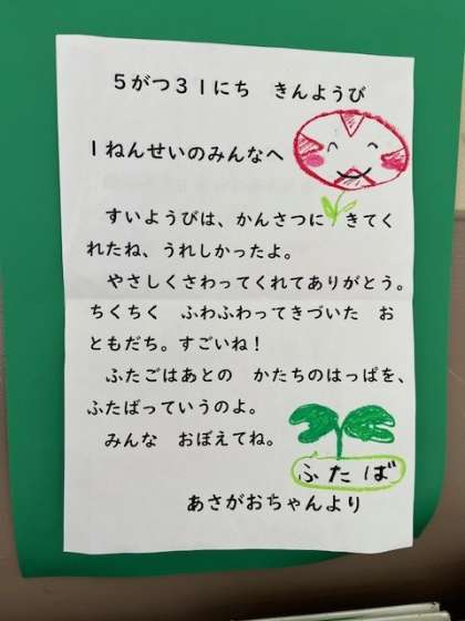 6月3日(月)1年の廊下にあさがおちゃんからの手紙がありました。