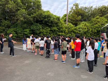 朝のつどい。今日誕生日を迎えた人をお祝いしました。ラジオ体操で、体を目覚めさせました。全員元気です。