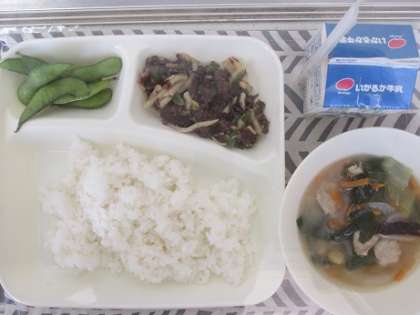 ごはん、ぎゅうにゅう、チンジャオニューロウスー、ちゅうかみそスープ、えだまめ
