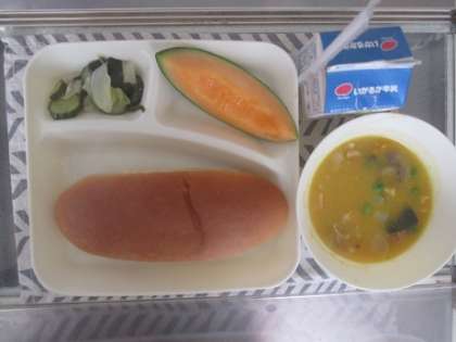 こくとうパン、ぎゅうにゅう、クインシーメロン、けいにくとかぼちゃのシチュー、ミックスかいそうのサラダ