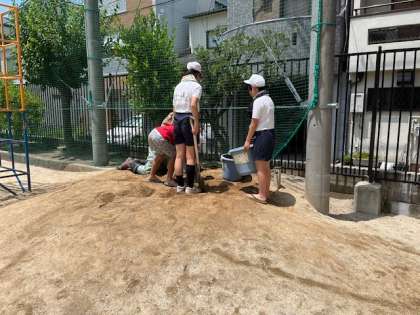 6月11日(火)5年が学習園の奥に田んぼをつくりました。土を掘り、山土を運び、力を合わせて作っていきました。