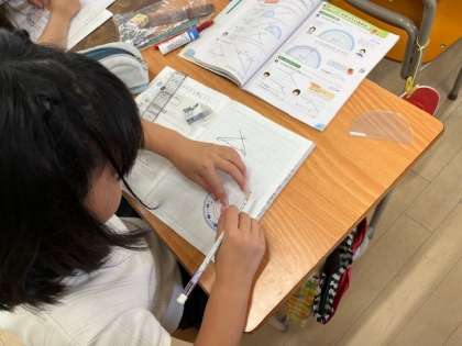 6月13日(木)1時間目、4年1組は算数で三角形のかき方を考え、ノートにかいていました。