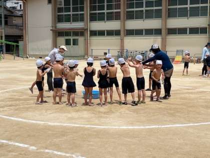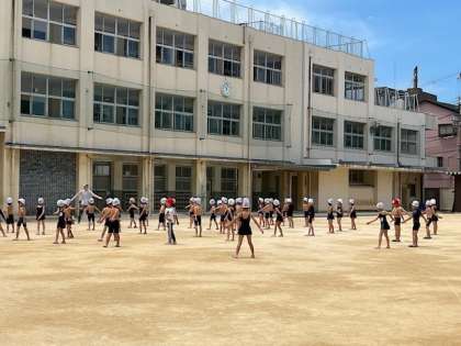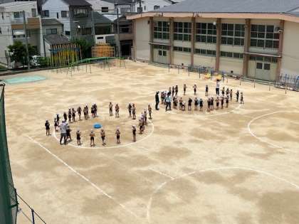 6月13日(木)3時間目、1年生が水着に着替えてラジオ体操を始めていたので、「あれ?」と思いました。よくみると生活科でプラスチック容器等を使って水遊びが始まりました。真ん中のたらいめがけて水を発射していました。このあとどんな遊びに発展していったのでしょう?来週から始まるプール水泳に備えて着替えたり、並んだりする練習にもなったようです。