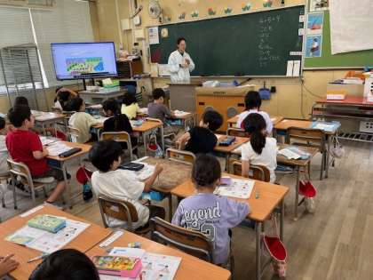 6月14日(金)2時間目、1年2組は算数で絵を見て4+5=9になるおはなしを作っていました。