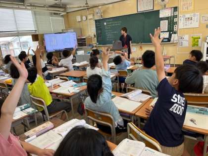 6月14日(金)2時間目、3年1組は算数で2つの棒グラフを比べて、どちらがわかりやすいかを考えていました。グラフのめもりによってわかりやすくなるのですね。