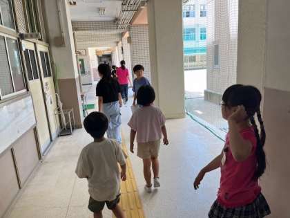 6月14日(金)3時間目、たてわりなかよし集会がおこなわれました。たてわり班で粉浜フェスティバルで行きたい店を話し合い、ろうかを班で歩く練習をしていました。