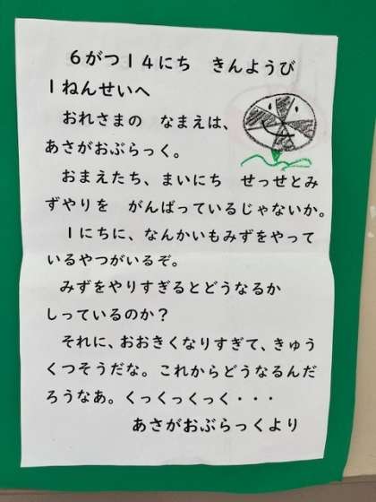6月17日(月)1年生の廊下にアサガオブラックからの手紙がありました。