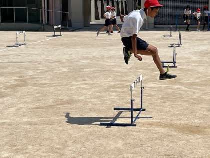 6月19日(水)5時間目、6年は体育でハードル走をしていました。