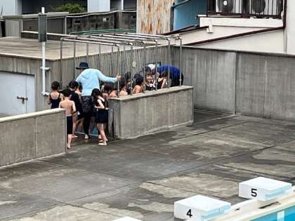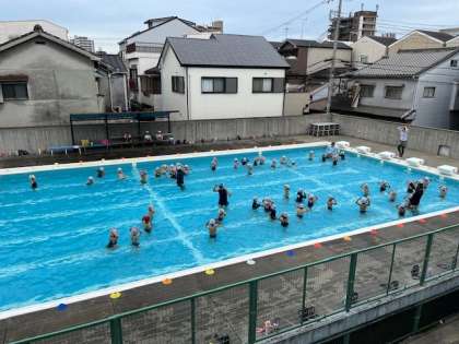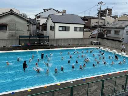 6月24日(月)2時間目、1年は今日、プール開きでした。「地獄のシャワー」を通過した後、音楽に合わせて水慣れをしていきました。