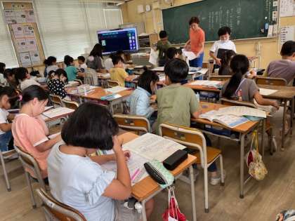 6月28日(金)3時間目、3年は1組も2組も国語で詩の清書をして、詩の内容に合うえを描いていました。納得のいく詩ができたようで、「見て、見て」と多くの子に言われました。