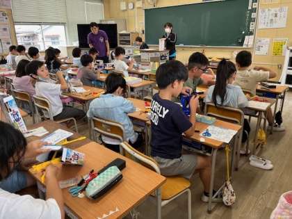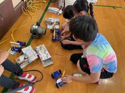 7月1日(月)1時間目、3年1組は理科で、風の強さを変えて、帆をつけた車の走り具合を調べていました。
