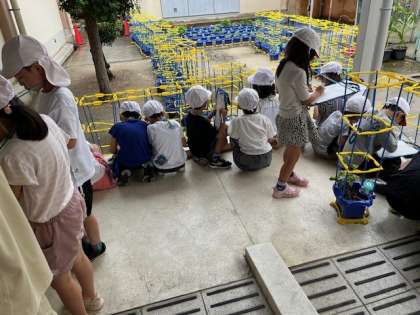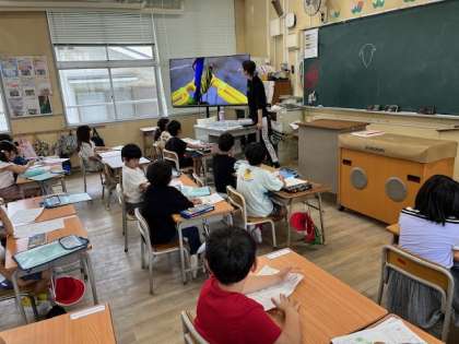 7月1日(月)3時間目、1年2組は生活科で、アサガオの観察をしました。葉の様子やつぼみの様子、ツルが支柱をまいている様子などを上手に絵や文であらわしていました。