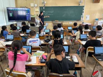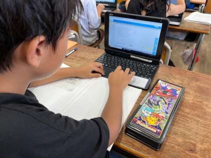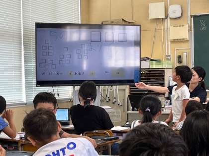 7月4日(木)3時間目、3年2組は算数でくじびき券の枚数から何回くじびきが引けるかを考えていました。あまりのくじびき券をどうするのかをパソコンの中で図にかいて考えていました。
