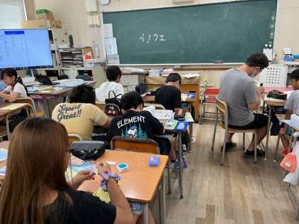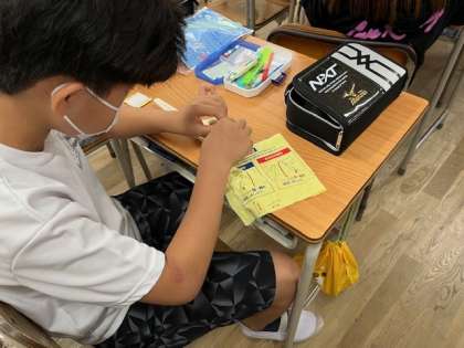 7月9日(火)1時間目、5年2組は家庭科で裁縫の練習をしていました。自分の名前をなみ縫いで作っていました。