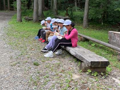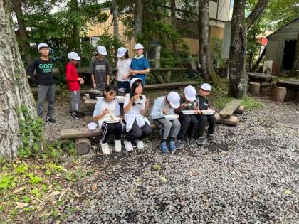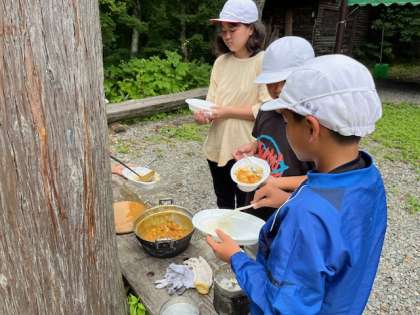 班ごとにカレーライスをいただいています。みんないい顔をしています。