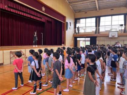 8月27日(火)学校に子どもたちの歓声がかえってきました。2学期の始業式には元気な顔がそろいました。2学期には今年のキーワード「おもろい」ことを考えて「おもろい」ことを実現していく子が多くいることを期待しているという話をしました。夏休みに頑張った賞状も授与しました。全校で歌う校歌は、さあ2学期が始まるぞという感じになりました。