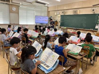 8月28日(水)2時間目、2年2組は音楽で「かえるのうた」を鍵盤ハーモニカで練習していました。