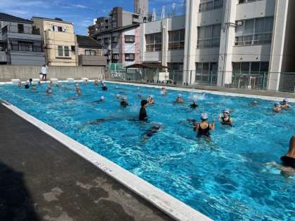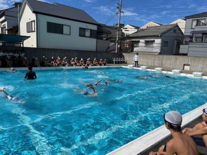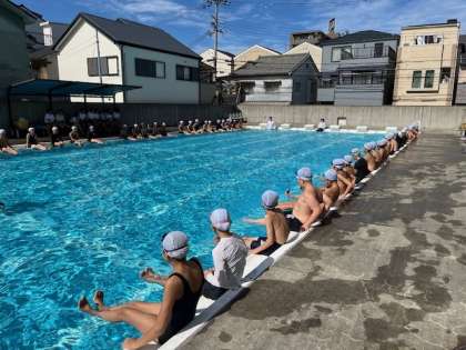 8月30日(金)1時間目、6年はプール水泳で平泳ぎの練習をしていました。