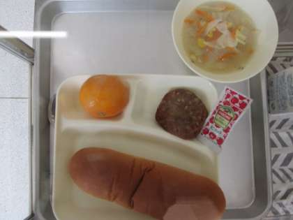こくとうパン、牛乳、冷凍みかん、焼きハンバーグ、ケチャップ、豆乳スープ