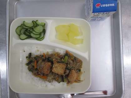 ごはん、牛乳、りんご缶、マーボーあつあげ丼、あっさりきゅうり