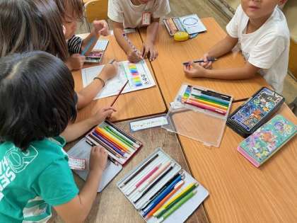 9月3日(火)2時間目、1年1組は学級活動で係の仕事と名前を書いた掲示物をつくっていました。