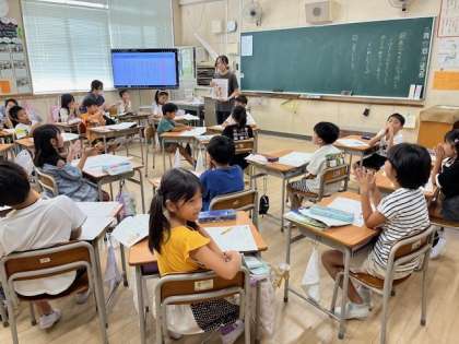 9月5日(水)2時間目、2年1組は国語で「あいづちをうったり、聞いたことばをくりかえしたりして相手の話を受け止めよう」というめあてで学習していました。クラスの真ん中で3人が話す様子で、よかったところを見つけ発表していました。